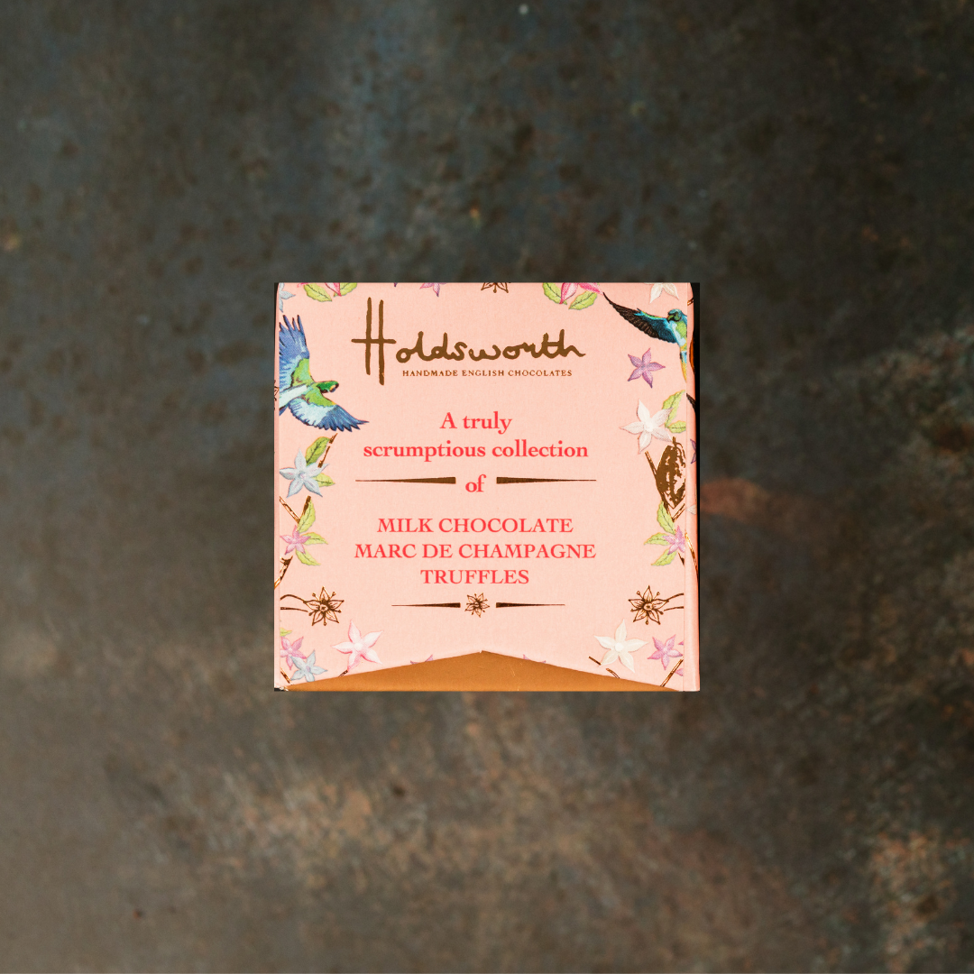 A decadent collection of our signature ganache truffle centres, blended with Marc de Champagne & enrobed in rich milk chocolate, packed into an elegant gift cube.